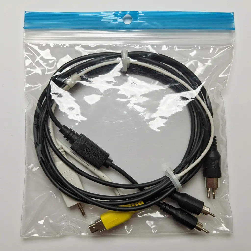 Keep chargers, adapters, and earbuds tangle-free in labeled ziplock bags.