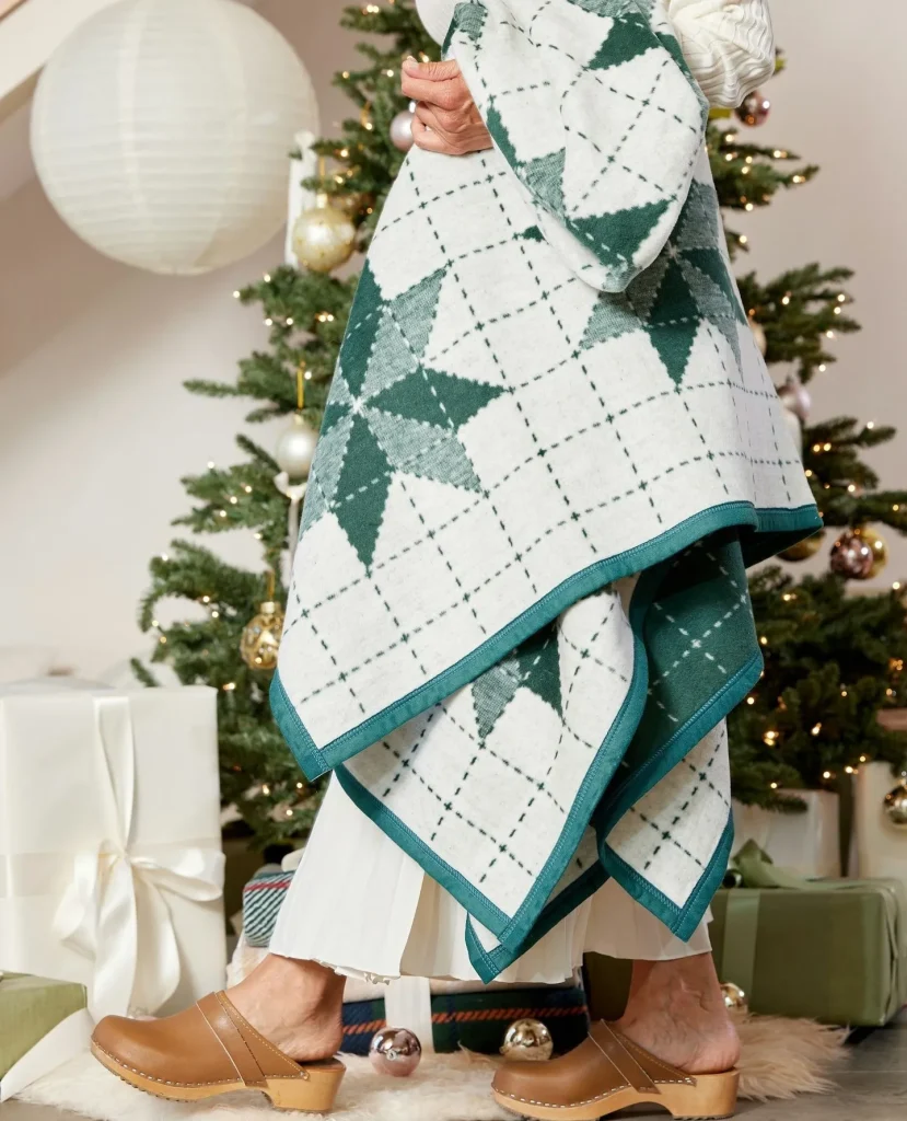 Bring in the chunky knit blankets, faux fur throws, and pillows with subtle holiday patterns like plaid, fair isle, or simple snowflakes.