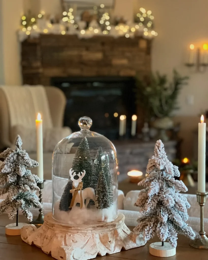 Place a small ceramic house, a single beautiful ornament, or a couple of mini trees on a base and cover it with the cloche.