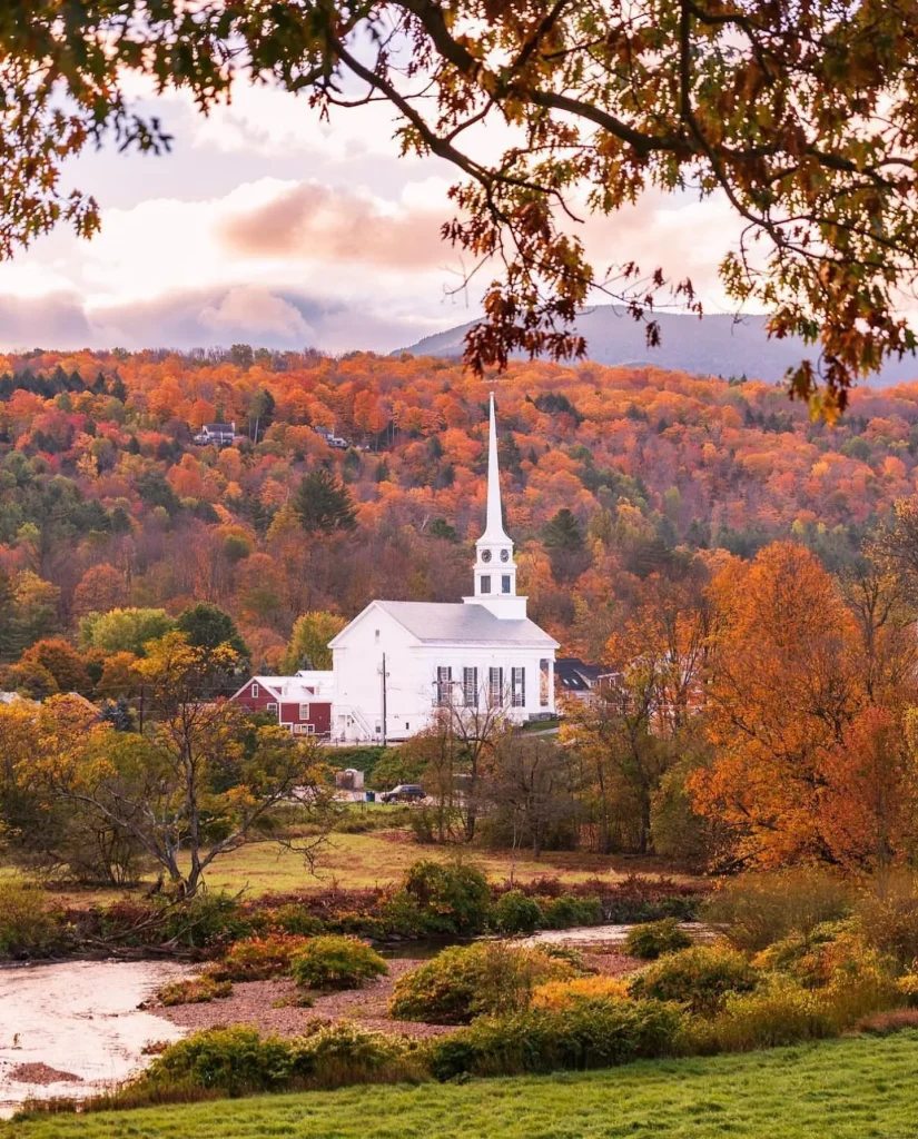 With its charming white-steepled church, covered bridges, and the explosion of color on Mount Mansfield, it’s the definition of Vermont In The Fall.