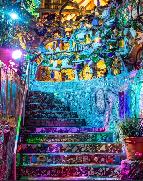 It’s a maze-like art environment covered head-to-toe in mosaics made from tiles, mirrors, bottles, and folk art.