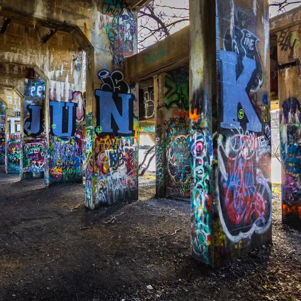 This abandoned coal-loading pier is now an unofficial, ever-changing outdoor art gallery.