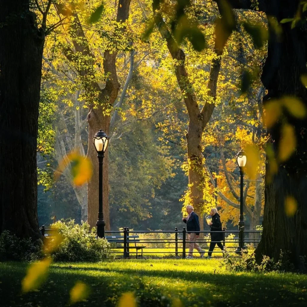 Think of the contrast between the colorful trees and the iconic skyline from a spot like The Ramble in New York’s Central Park or the Japanese Garden in Portland, Oregon.