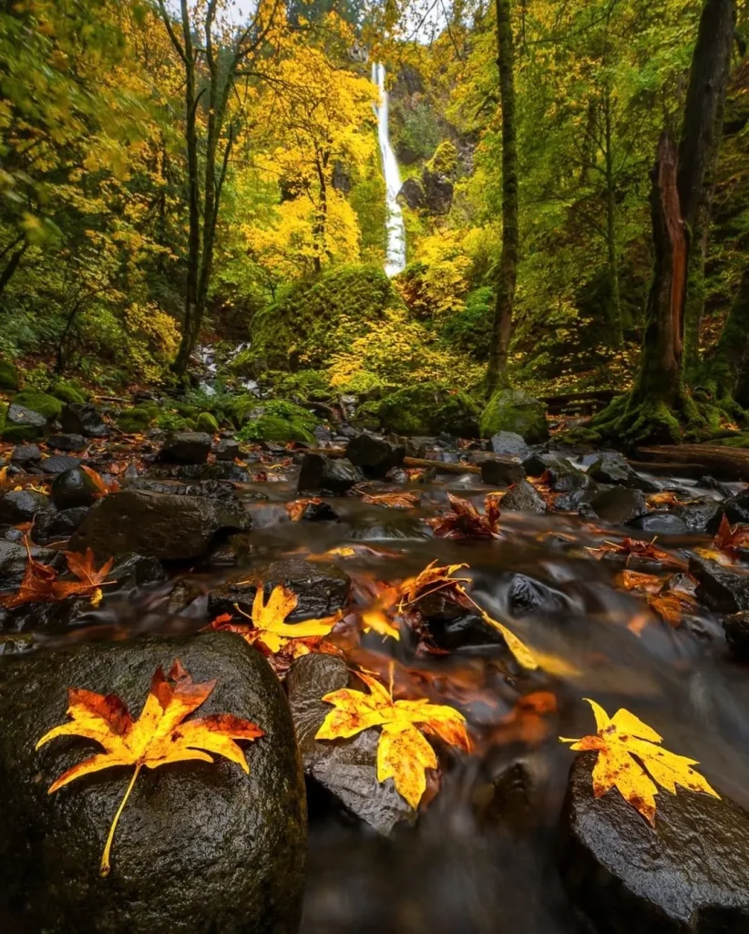 In the fall, the surrounding maples and alders turn brilliant shades of yellow and orange, framing the cascades in fiery color.