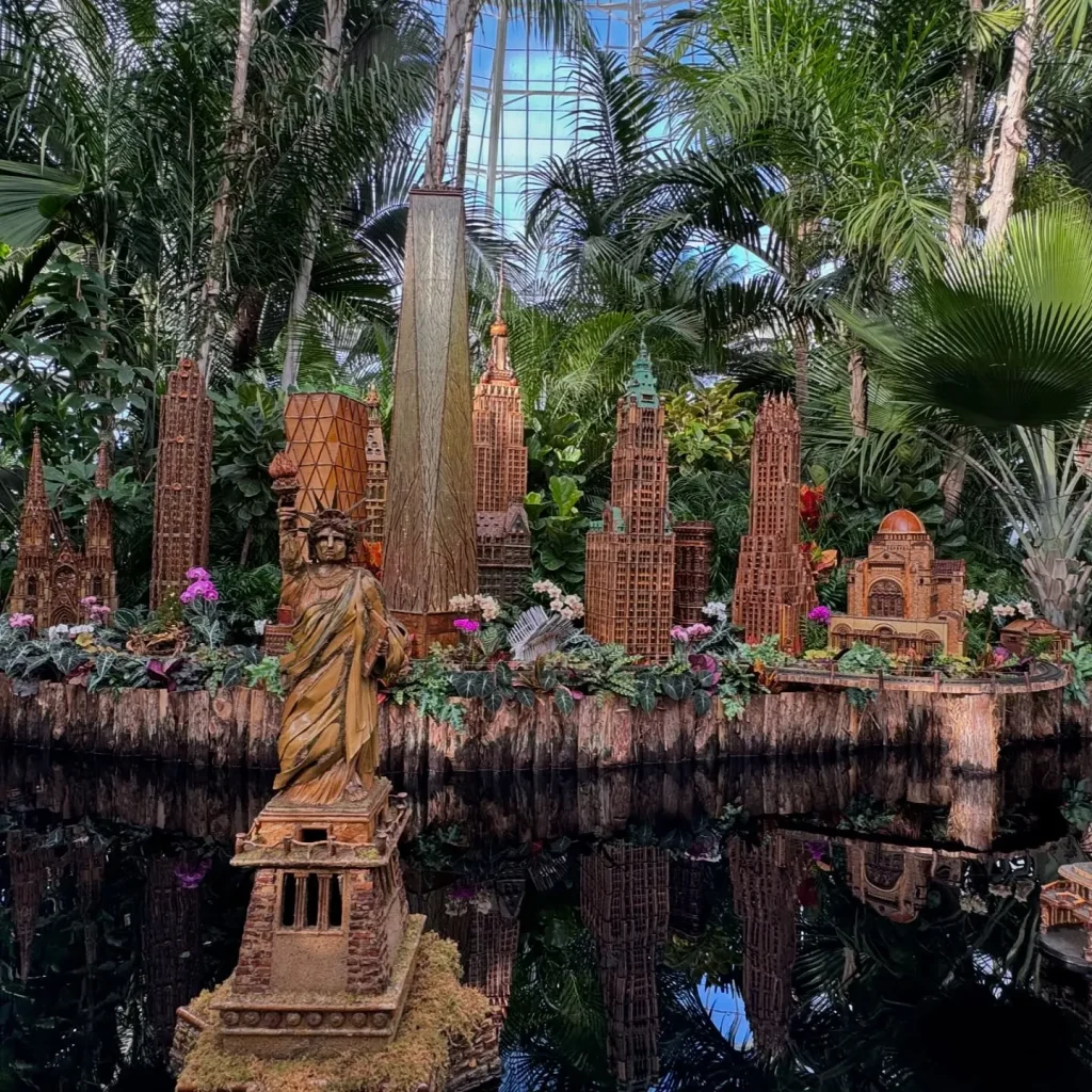It features model trains zipping through a miniature landscape of NYC landmarks made entirely from natural materials like bark, leaves, and twigs.