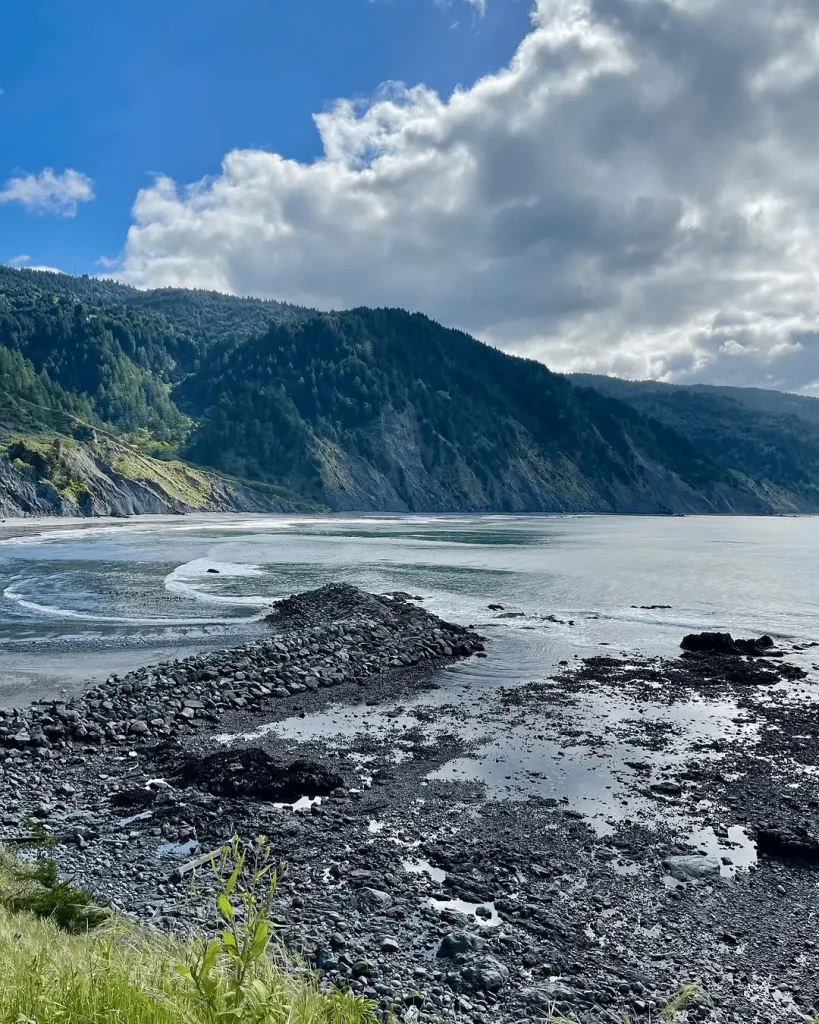 Insta-Worthy Moment: A shot of your tent pitched on a deserted black sand beach, with the Pacific waves crashing nearby and the rugged King Range mountains rising behind you.