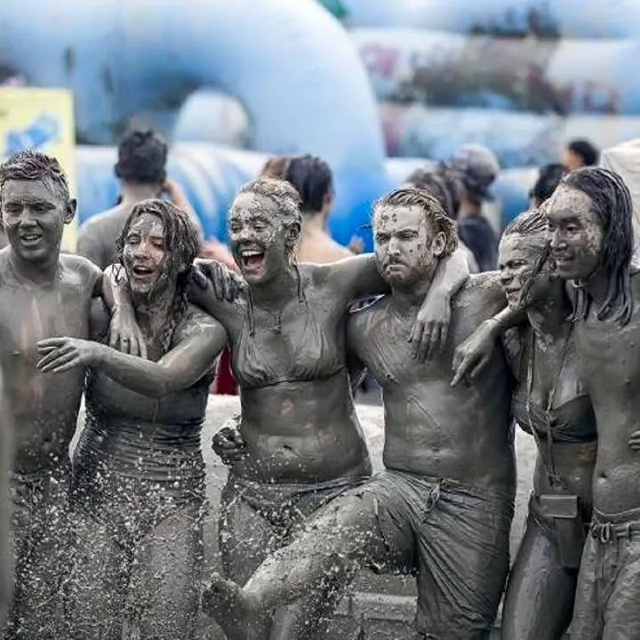Participants slather themselves in mineral-rich mud from the Boryeong mud flats, enjoying mud wrestling, mud sliding, and mud obstacle courses.
