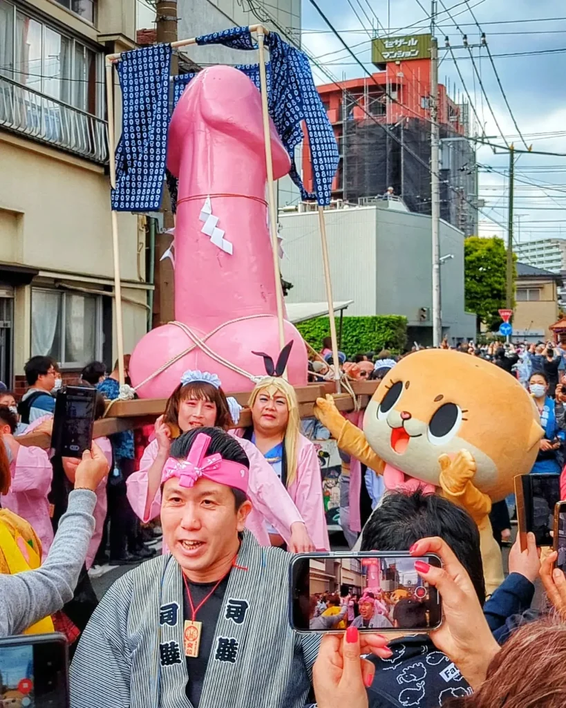 Parades feature giant phallus-shaped mikoshi (portable shrines), and phallus-themed candies and souvenirs are abundant.