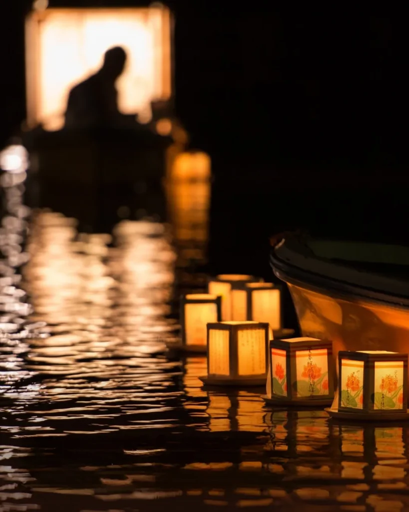 Lanterns are floated down rivers to guide spirits, and traditional Obon dances (bon odori) are performed.