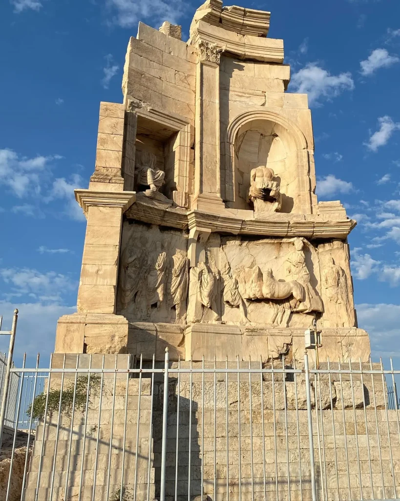 The main viewpoint is at the Philopappos Monument, a marble tomb built for a Roman prince and benefactor of Athens.