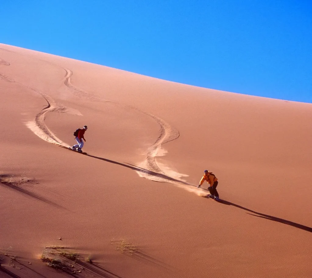 If you haven’t tried sandboarding yet, WYD? It’s exactly what it sounds like: snowboarding, but on hot sand.