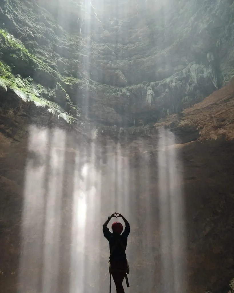 Walk through a muddy tunnel to the main cave where sunlight beams down through the roof. It’s ethereal.
