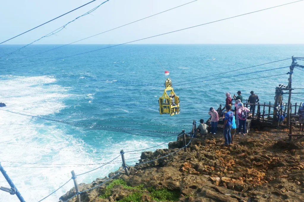 If you want to test your trust, this is it. A manual wooden gondola on ropes that drags you across crashing waves to a small rocky island.