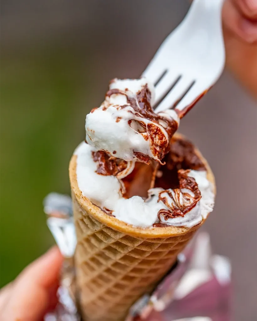 Fill a waffle cone with chocolate chips, mini marshmallows, and maybe some sliced strawberries or banana.