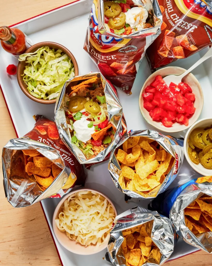 Everyone gets their own individual-sized bag of corn chips (like Fritos or Doritos).