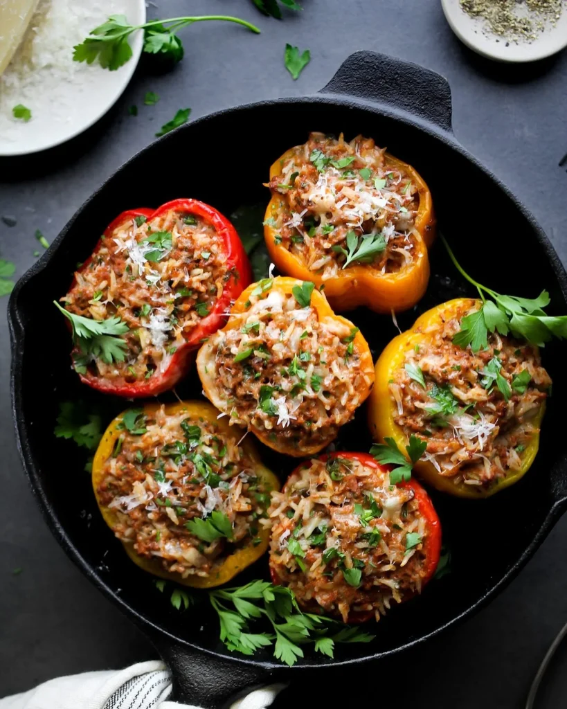 Fill them with a mixture of cooked rice, ground beef or turkey, diced tomatoes, and some cheese.
