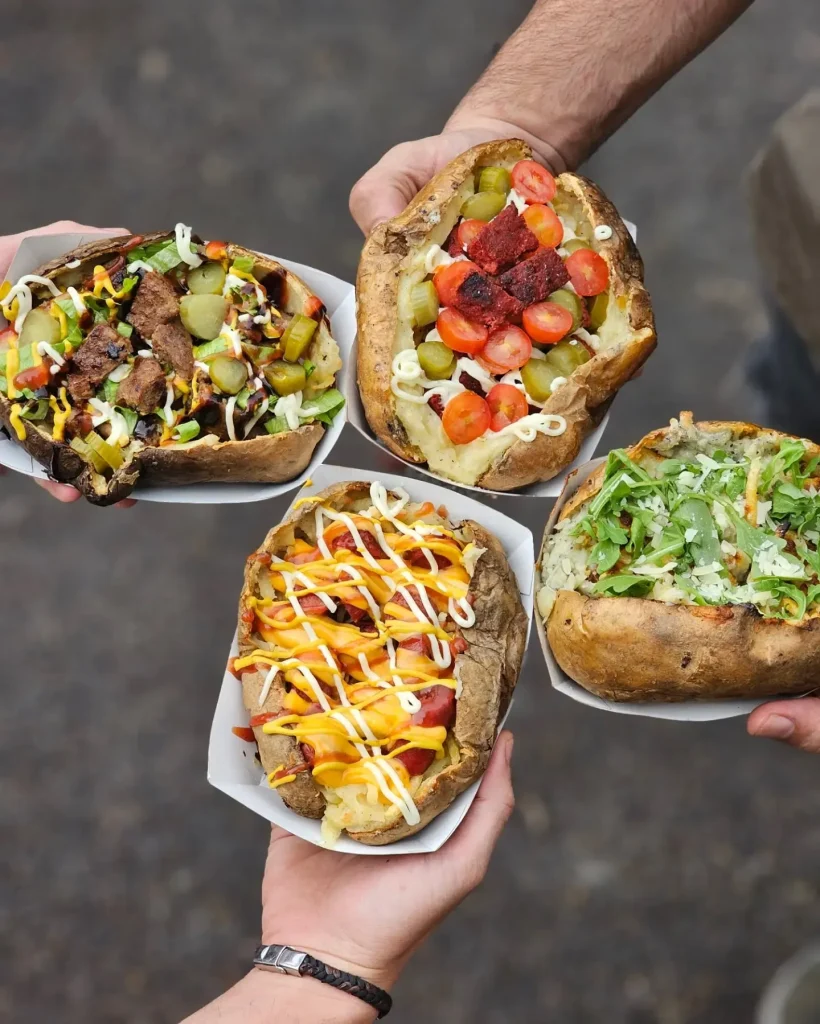 Once done, split them open and set up a topping bar: shredded cheese, bacon bits, chili, sour cream, chives, butter.