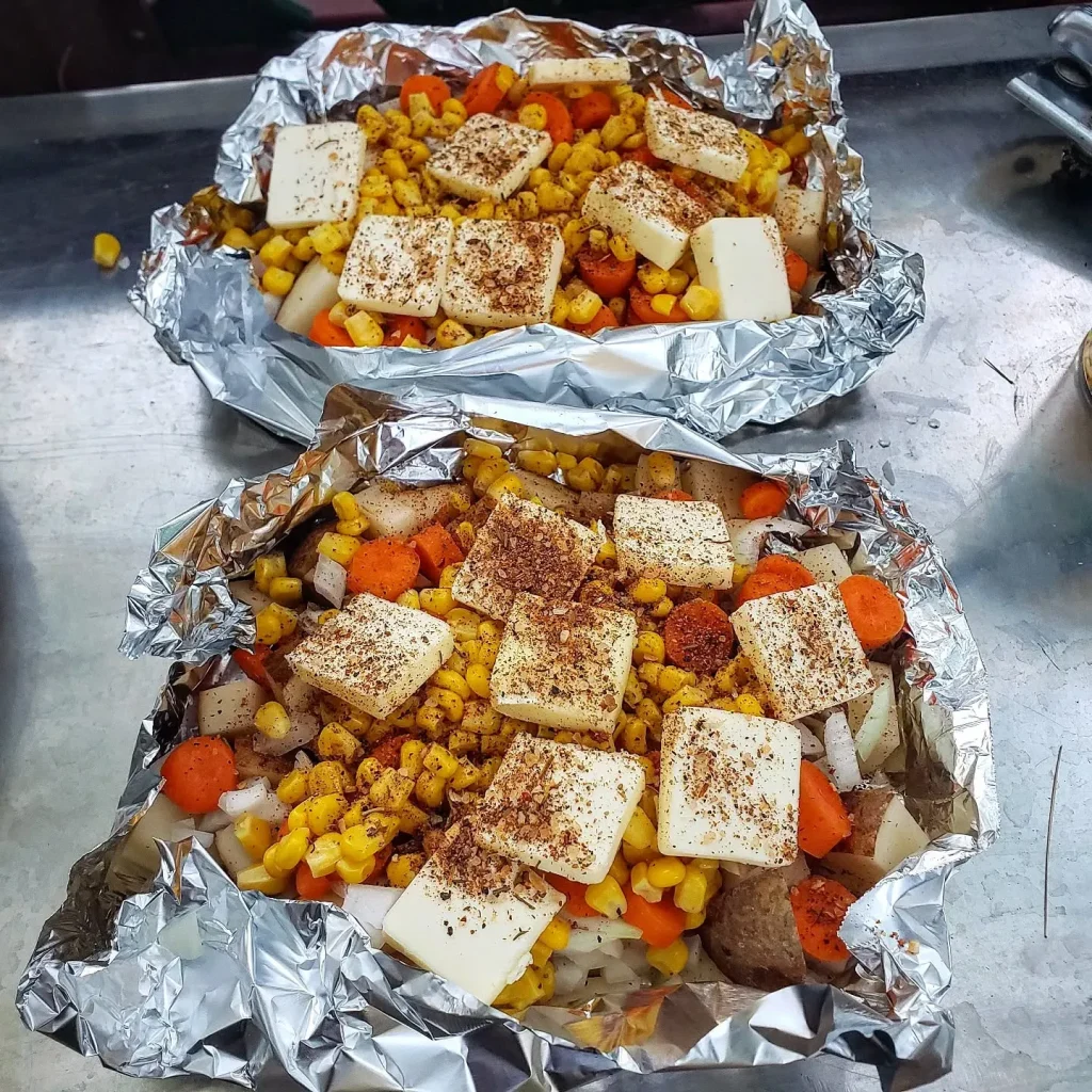 Season it up, seal the packet tight, and toss it onto the hot embers.