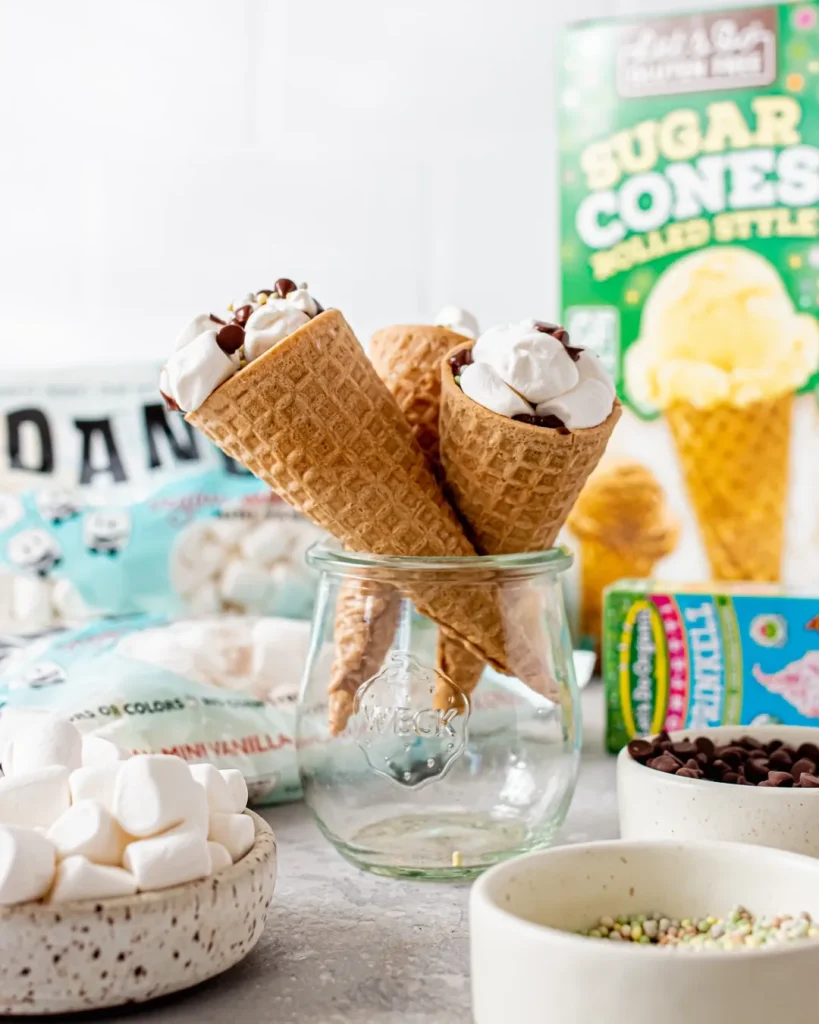 Take a waffle cone and let everyone fill their own with chocolate chips, mini marshmallows, banana slices, berries, or caramel bits.