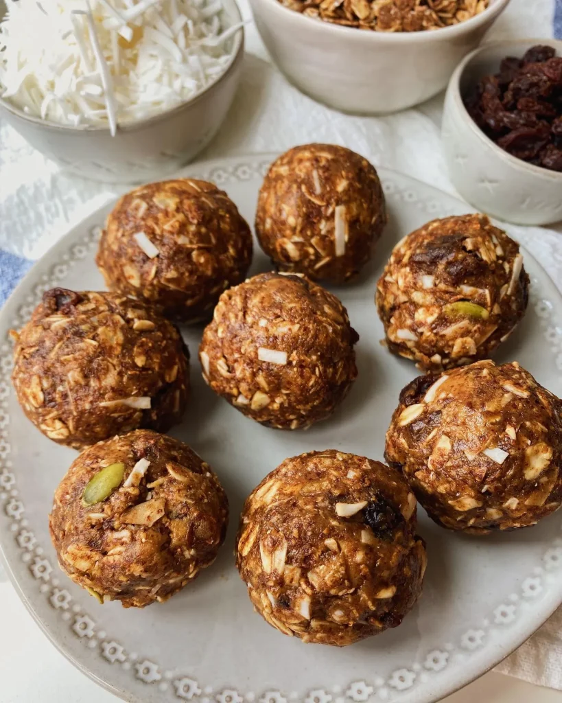 Combine oats, a fat source like peanut butter or sunflower seed butter, a sticky sweetener like honey, and some add-ins like chia seeds, shredded coconut, and mini chocolate chips.