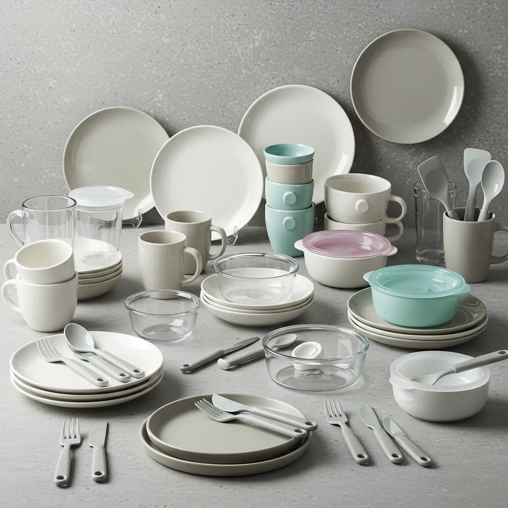 Plates, bowls, and cutlery for dorm-friendly meals.