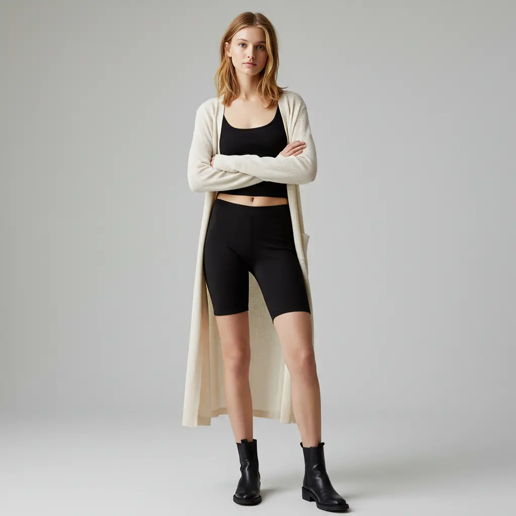 For a layered yet comfy look, try biker shorts with a long cardigan and tank top. It’s the perfect mix of casual and cute.