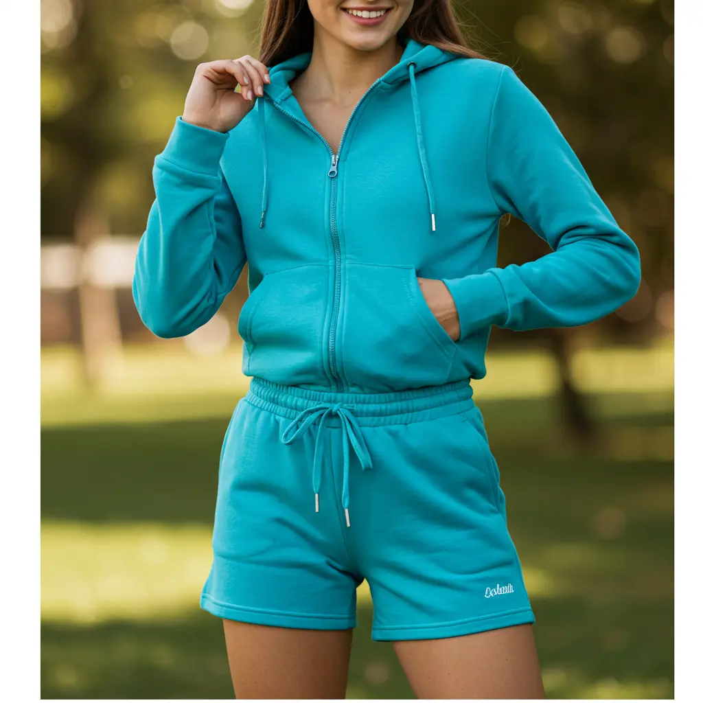 If the weather is warm, opt for sweat shorts and a comfy zip-up hoodie. It’s a great mix of breathability and warmth when needed.