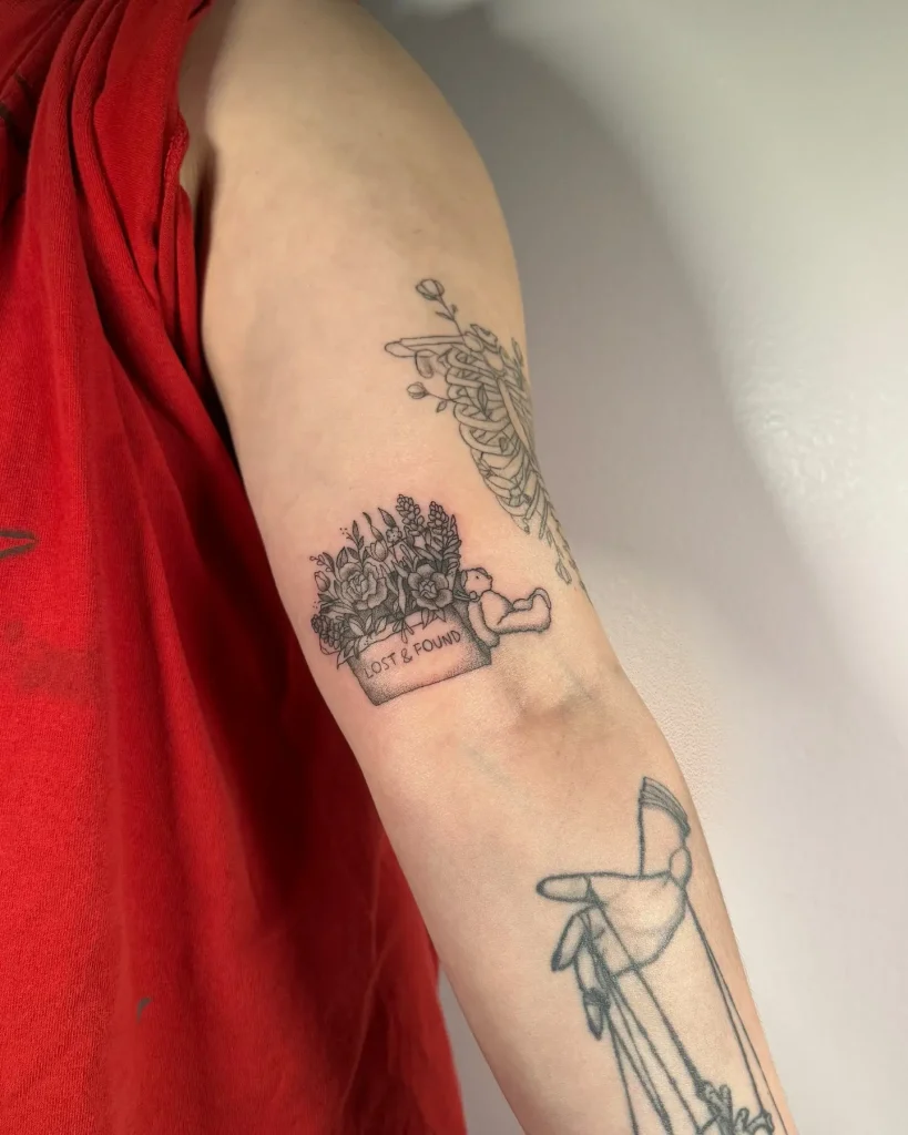 A playful tattoo designed like a vintage “Lost & Found” sign, but perhaps reading “Happily Lost” or just “Lost & Looking.