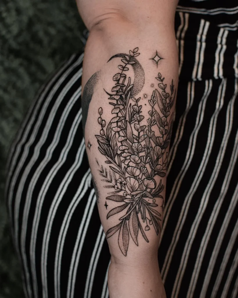 For the green witches out there, a tattoo of magical herbs like lavender (calm), rosemary (remembrance), or sage (cleansing) is a beautiful way to honor your connection to the earth.