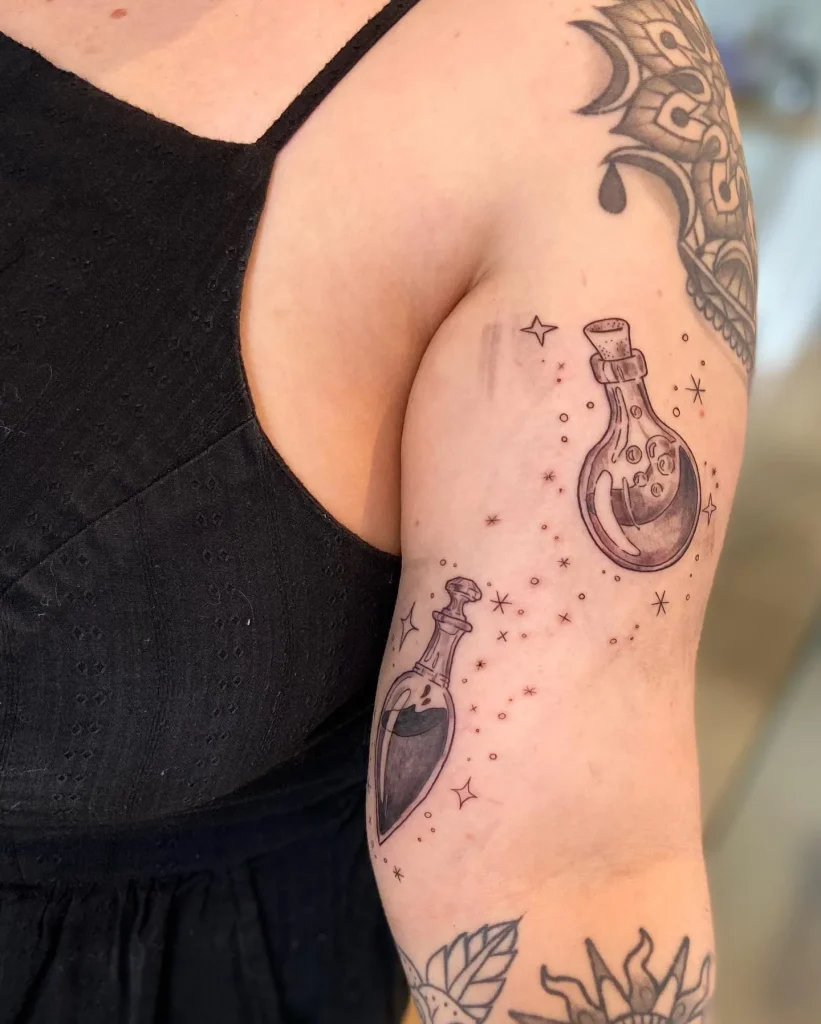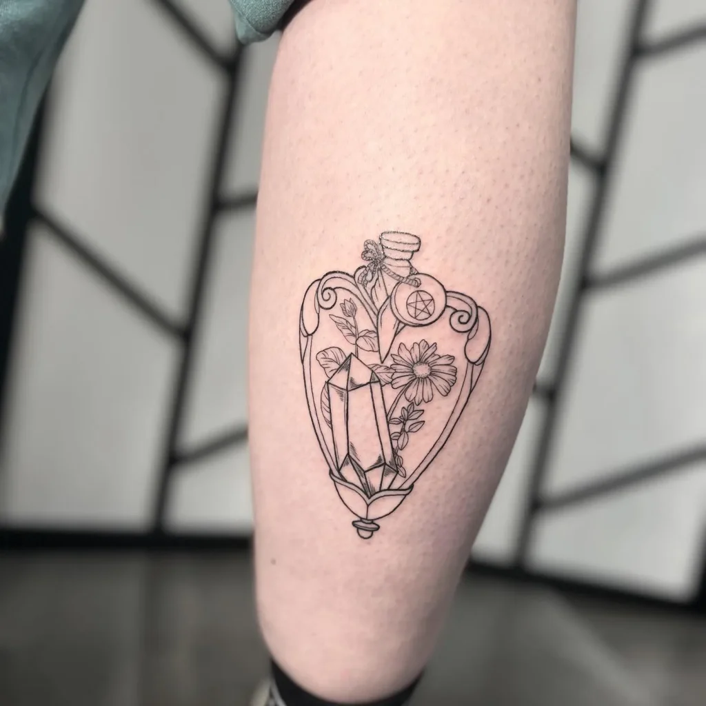 A tiny tattoo of a spell jar is one of the most charming Witchy Tattoo Ideas.