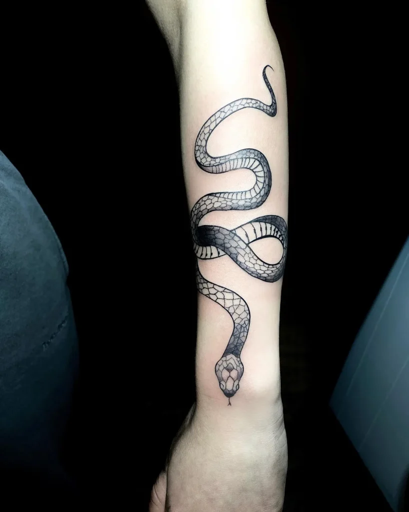 A snake winding up a forearm is a classic look for Arm Tattoos For Women, but they also look incredible snaking up the ankle or even as a bold Back Tattoo Women would rock.