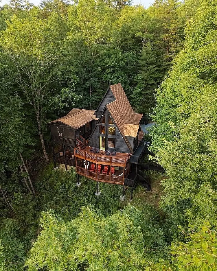 An A-frame cabin tucked into a snowy forest or a cozy cottage surrounded by lush greenery.