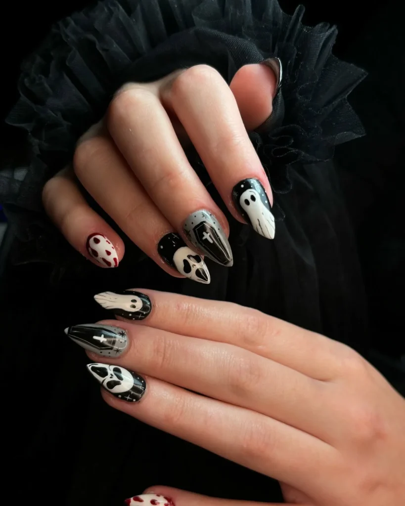 Paint each nail with a different design: one ghost, one spiderweb, one solid orange, one black with glitter, one blood drip.