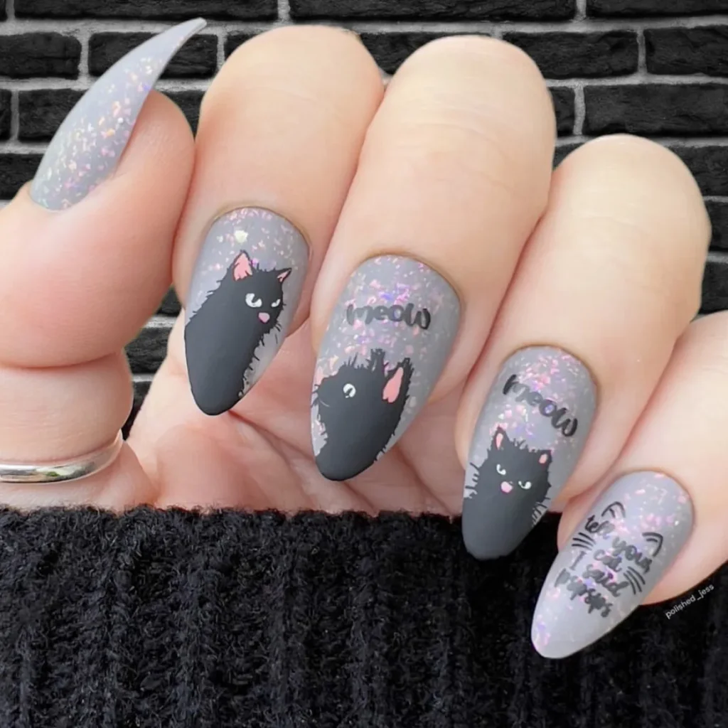Then, on an accent nail, use black polish to paint a small, seated cat shape.