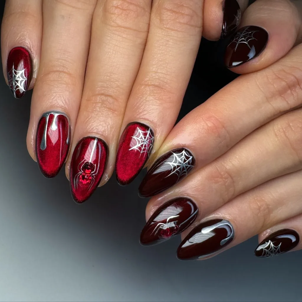 Go for a full set of glossy black nails, but on your ring finger, create a delicate, sharp spiderweb in white or silver.