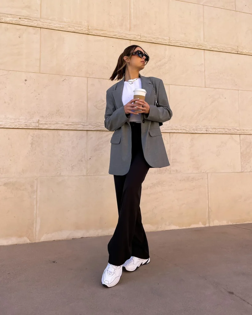 An oversized or slightly structured blazer in black, navy, or plaid adds a layer of sophistication to the simplest outfits.