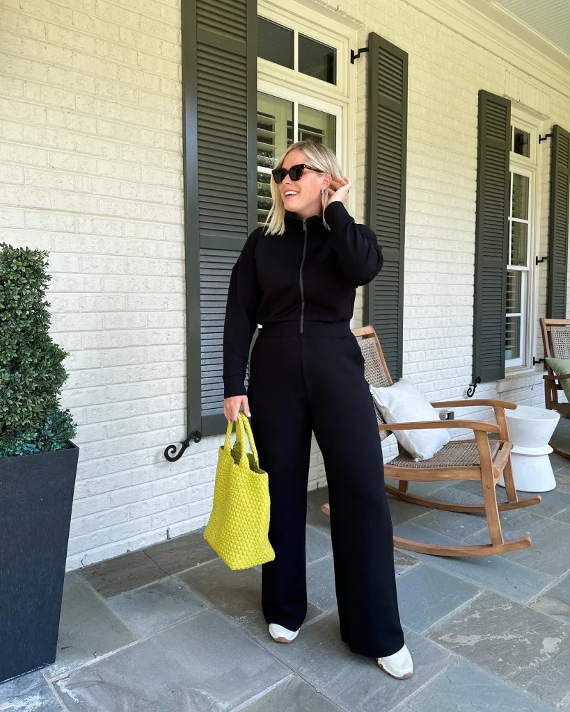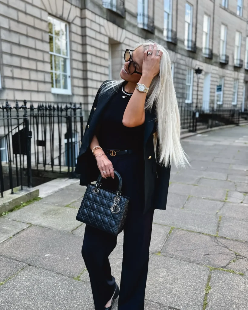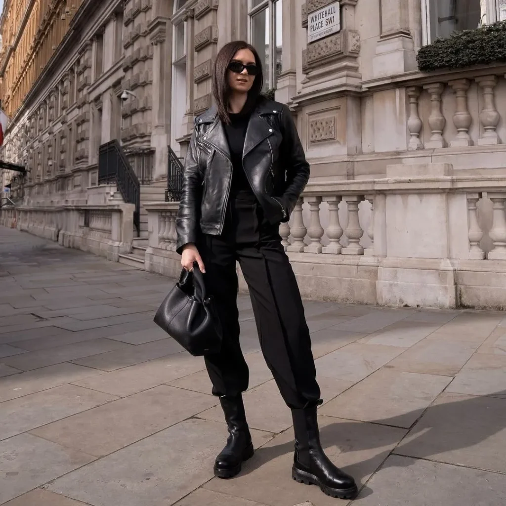 An all-black look is eternally chic: black sweater, black trousers, black boots, black coat.