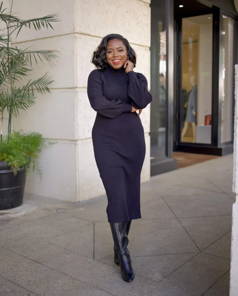 Choose a midi-length style in a versatile color like black, charcoal, or burgundy.