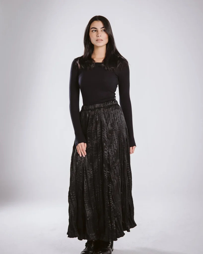 Choose a slip skirt in a jewel tone or a pleated one in a neutral color.