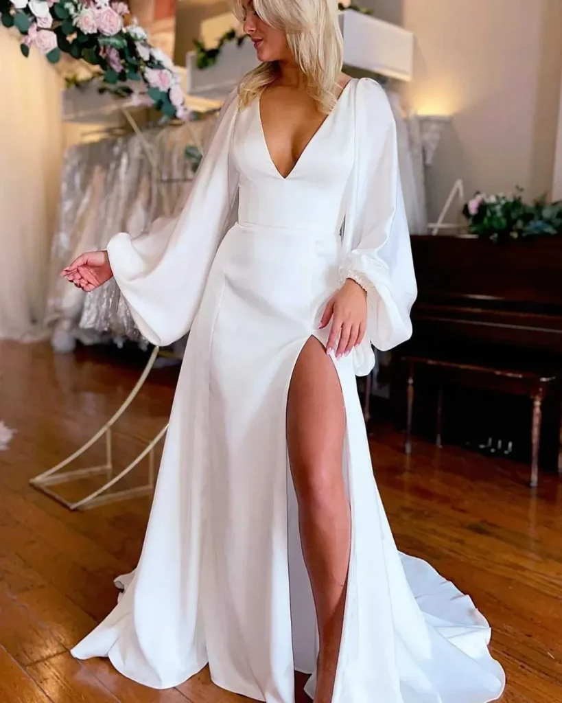 Whether it’s a delicate sheer sleeve, a dramatic bishop sleeve, or a simple fitted sleeve, this style adds an element of grace and is super practical for cooler weather.