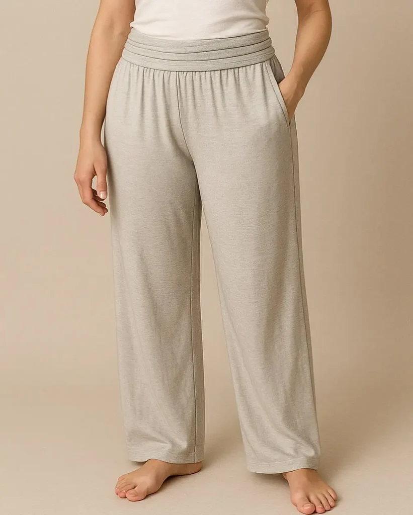 Look for materials like ribbed knit, soft jersey, or even a drapey Tencel. A high waisted style with an elastic or drawstring waistband is key for comfort.