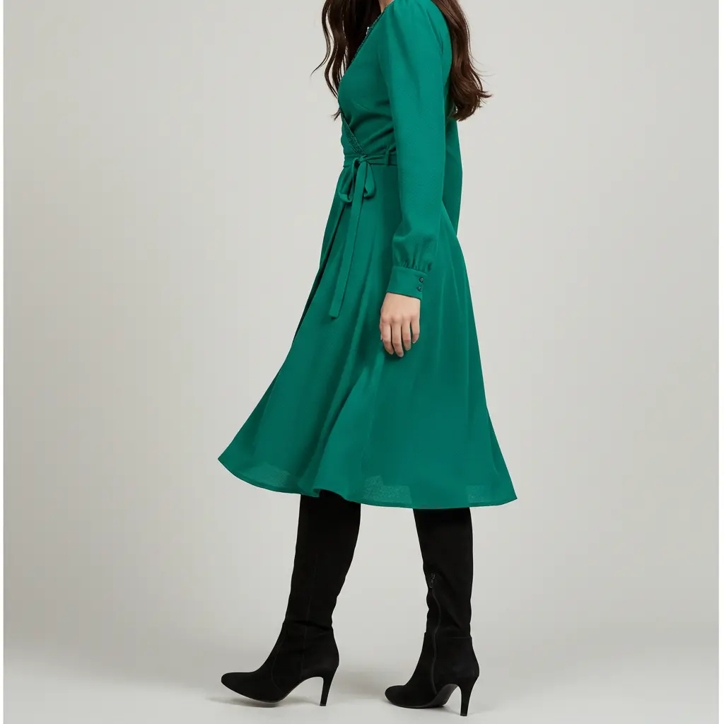 A wrap dress flatters every body type, and knee-high boots add warmth and style.