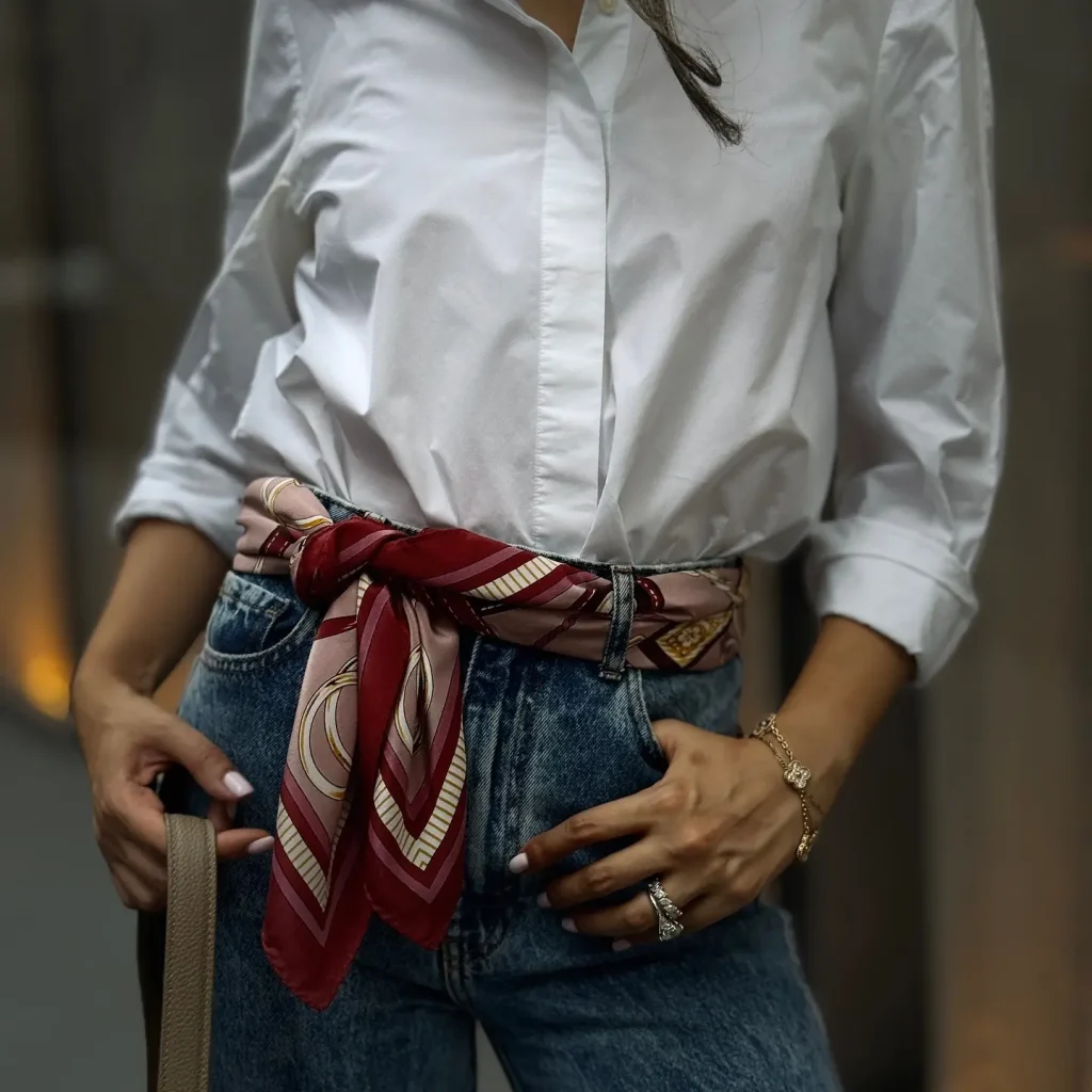 A vibrant silk scarf can be a headband, a neck tie, a bag charm, or even a belt.