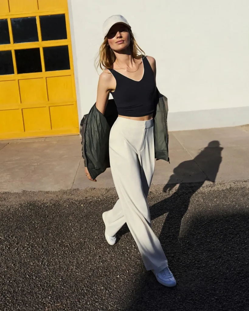 Think wide-leg crops, chic joggers, or tailored stretch trousers.