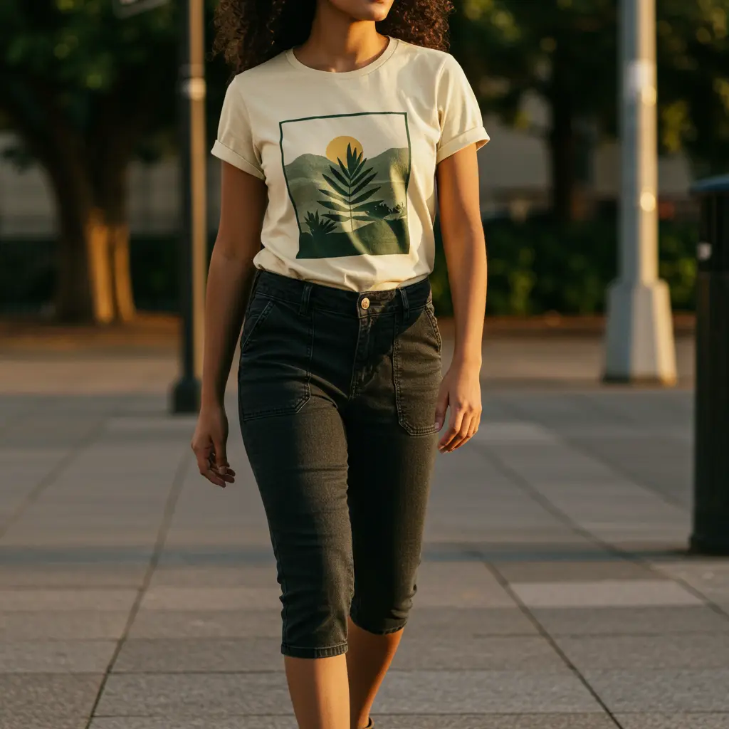 Capris give you a comfortable middle ground between shorts and full-length pants. A modest graphic tee adds a personal touch.