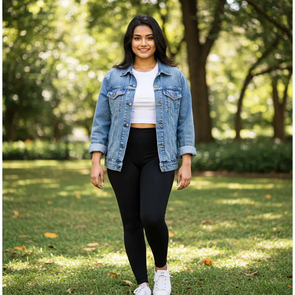 1. Denim Jacket + White Tee + High-Waisted Leggings + Sneakers