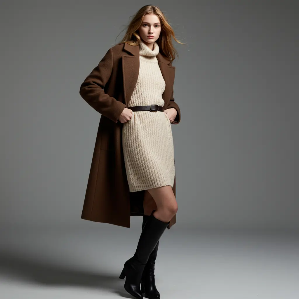 16. Knit Dress + Belted Coat + Knee-High Boots