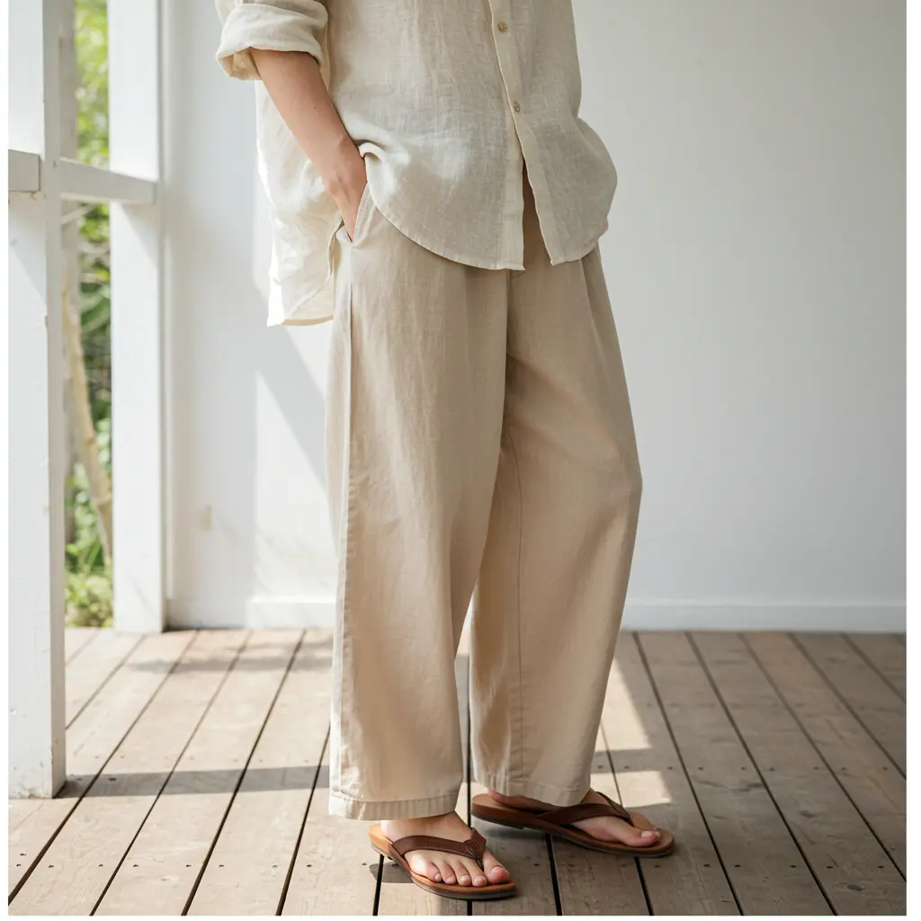 7. Linen Shirt + Wide-Leg Pants + Flip-Flops