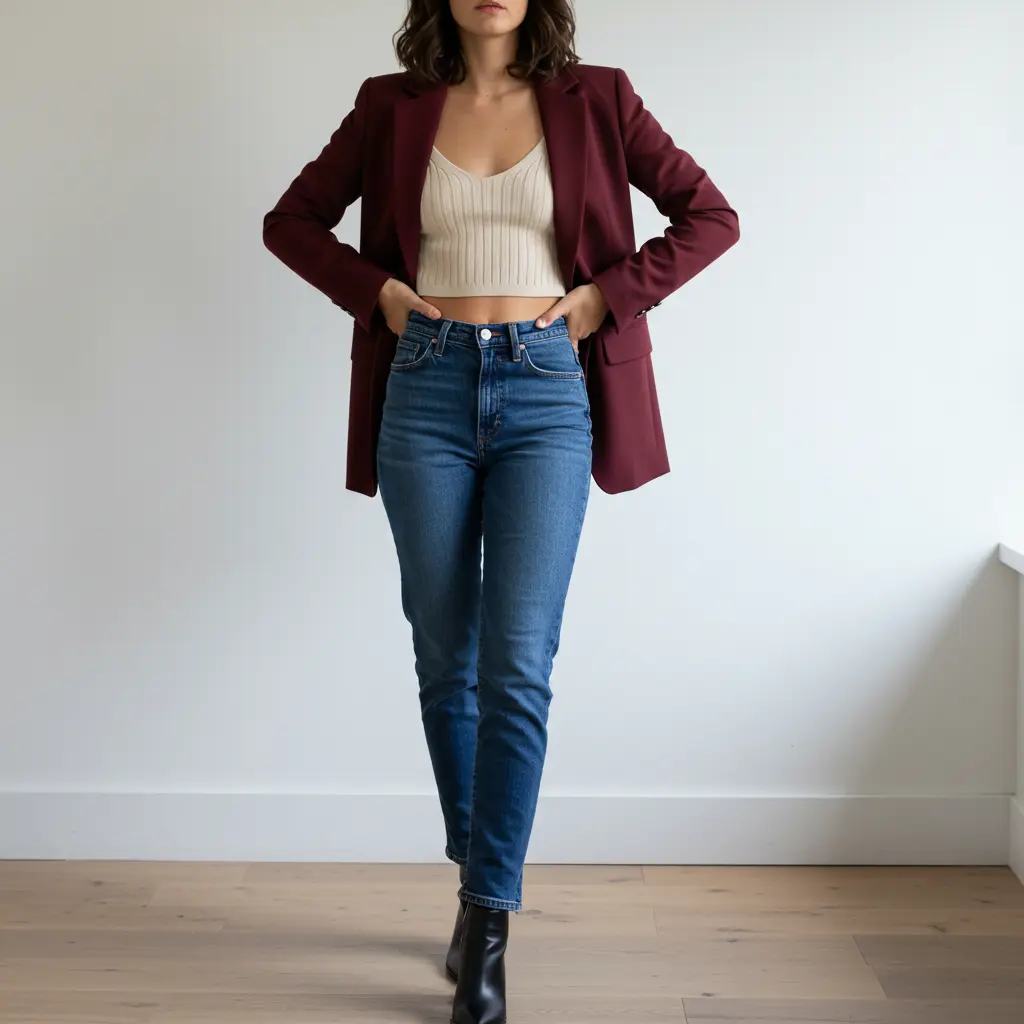 A city-perfect outfit that’s both polished and trendy. The blazer adds sophistication, while the crop top keeps it playful.