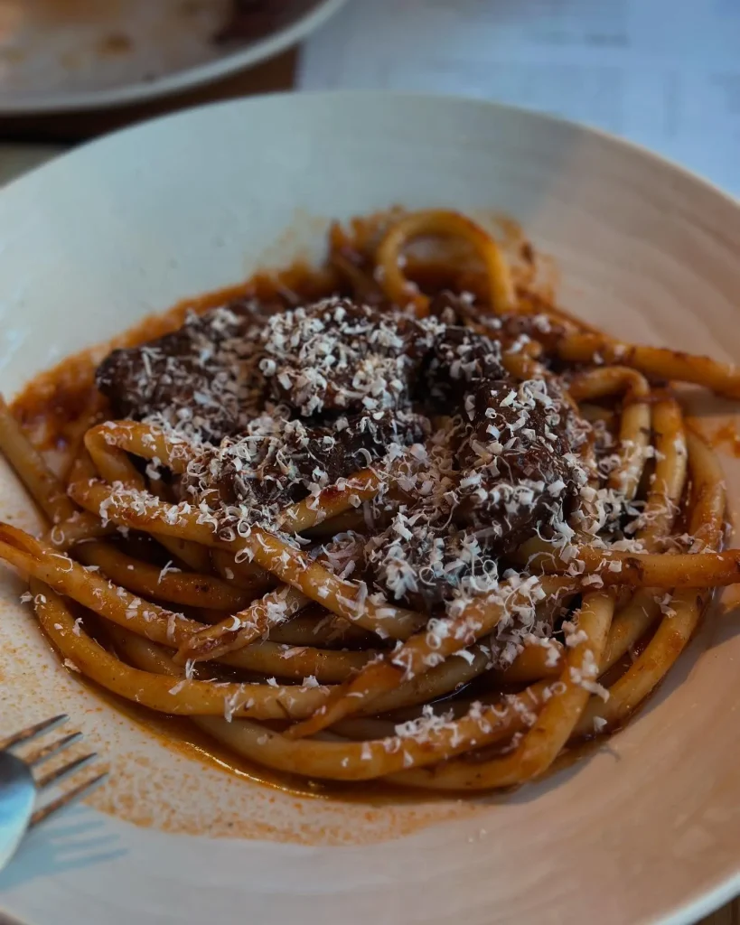 Think rooster or beef slow-cooked in a spicy red wine and tomato sauce, served over thick pasta.